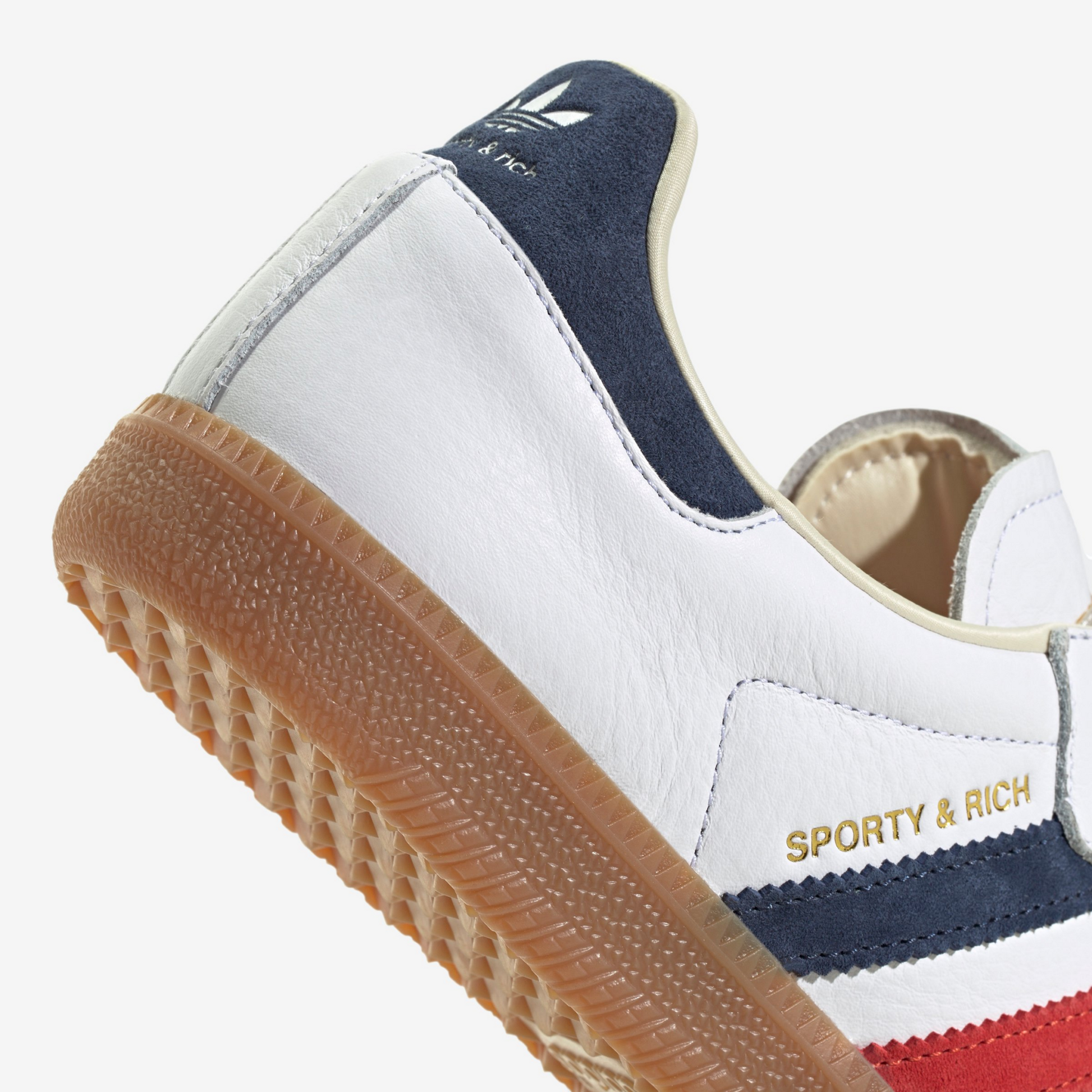 Co-branded details, including Sporty & Rich labeling near the stripes, add a refined touch of exclusivity. The gum rubber outsole preserves the original Samba DNA, offering reliable traction and that signature retro finish.