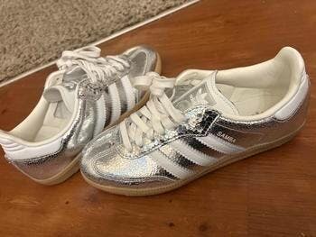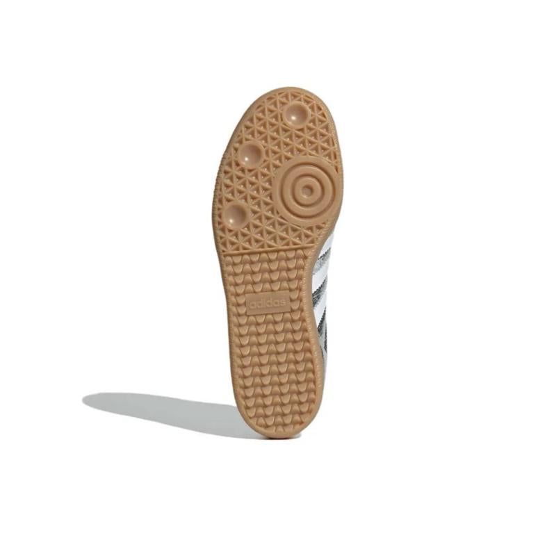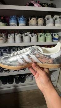 The Samba OG "Silver Metallic Cracked Leather" for women revitalizes the classic Samba silhouette with a bold, contemporary twist. This version features a striking silver metallic cracked leather upper, offering a unique textured look that catches the eye.